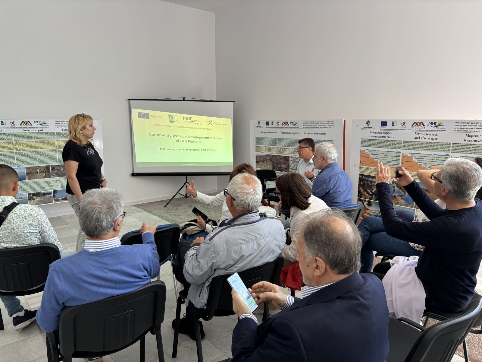 Срещата започна в офиса на СНЦ „МИГ Поморие“ с приветствие от Председателя на УС на Сдружението г-н Иван Алексиев. Изпълнителният директор на Сдружението г-н Бояджиев изложи кратка презентация с представяне на МИГ Поморие и изпълнените дейности и постигнатите резултати по проекта (дейности, иновации и др.).