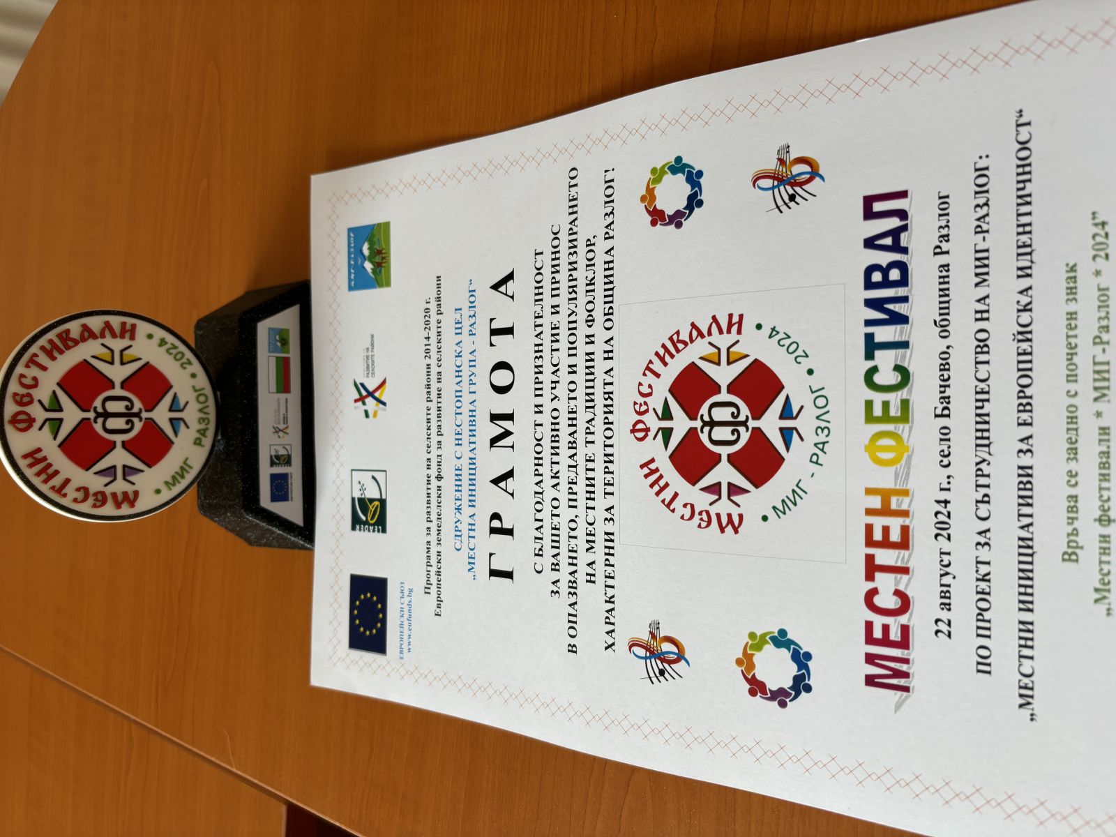 Фестивалът на МИГ Разлог беше насочен към народните читалища от населените места на Община Разлог. В края на събитието Изпълнителният директор на МИГ Разлог – г-жа Венета Нанева връчи на Председателя на Управителния съвет на МИГ Поморие – г-н Иван Алексиев почетна грамота за участие и почетен знак „Местни фестивали МИГ Разлог 2024“ в знак на признателност за успешното и ползотворно дългогодишно партньорство между двете местни инициативни групи.